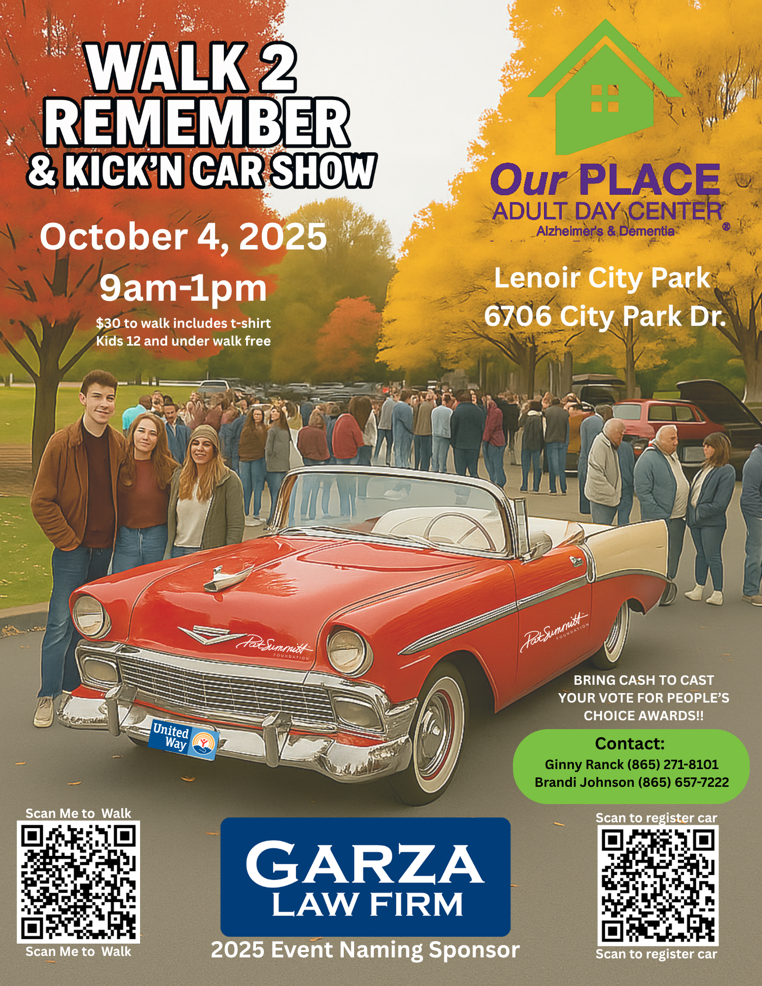 Join us for the 3rd Annual Walk 2 Remember & Kickin' Car Show! This exciting event brings together community members for a meaningful walk and a fantastic display of vehicles. Walk 2 Remember: Lace up your shoes and join us for our 3rd annual walk, dedicated to remembering and honoring loved ones. To sign up for our walk click this link: https://form.jotform.com/251644726384160 Kickin' Car Show: Get ready to admire a wide variety of cars, from classics to modern marvels! If you're interested in showcasing your vehicle, please click here to register: https://form.jotform.com/240654224917154. Awards will be given in various categories. What to Expect: A heartfelt walk to honor memories, dozens of amazing cars on display, family-friendly atmosphere Coffee & food truck will be on-site (more details to follow!) This event is a wonderful opportunity to connect with the community, support a great cause, and enjoy a fun-filled day at Lenoir City Park. Admission: $30/person to walk (includes a t-shirt, must preregister to guarantee a shirt), kids 12 and under walk free (will not receive a t-shirt). Car Show is $20/car without a t-shirt or $30/car includes a t-shirt. (Must preregister to guarantee a t-shirt. If you would like to be a walk sponsor please click this link: https://www.walk2remember.net/sponsor Invite your friends and family! We can't wait to see you there! All proceeds from our Walk 2 Remember & Kickin' Car Show will directly support the programs at Our PLACE, offering vital respite for caregivers and creating more joyful moments for those we serve.