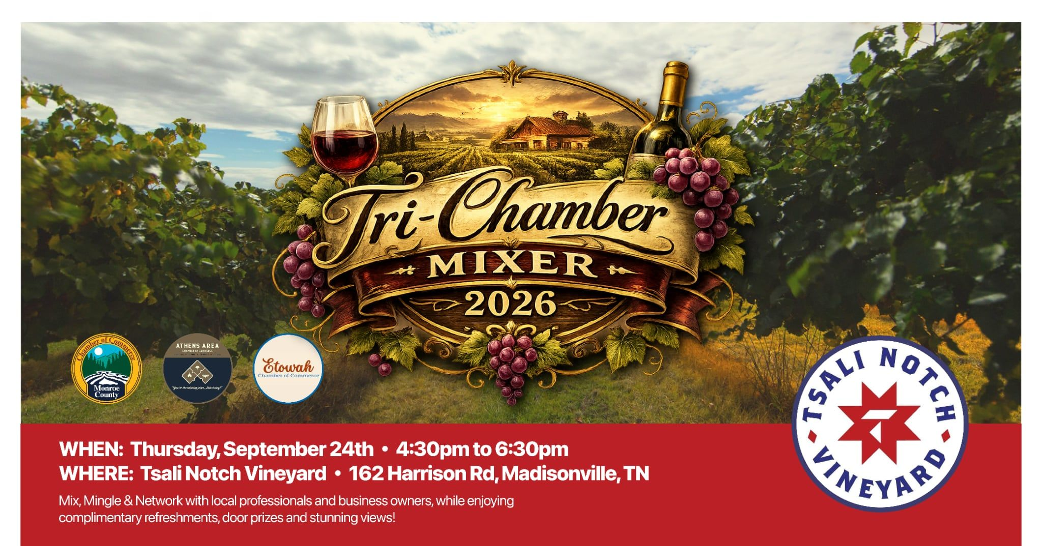 Join the Monroe County, Etowah, and Athens Area Chambers of Commerce for a premier Tri-Chamber Mixer at the beautiful Tsali Notch Vineyard. This is a unique opportunity to expand your professional circle beyond city lines and build lasting relationships with fellow business owners from across the region.
